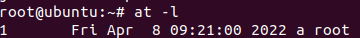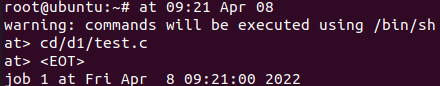 3.at > 예약할 프로그램 경로 -> ctrl+d를 눌러 빠져 나오면 job 1 at Fri Apr 8 09:21:00 2022이라고 예약 완료
