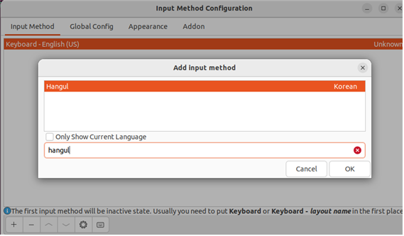 configure을 누르고 + 버튼을 누르면 위 창이 뜨는데 only show current language 부분을 체크표시해제 -> Hangul을 검색 후 확인합니다.