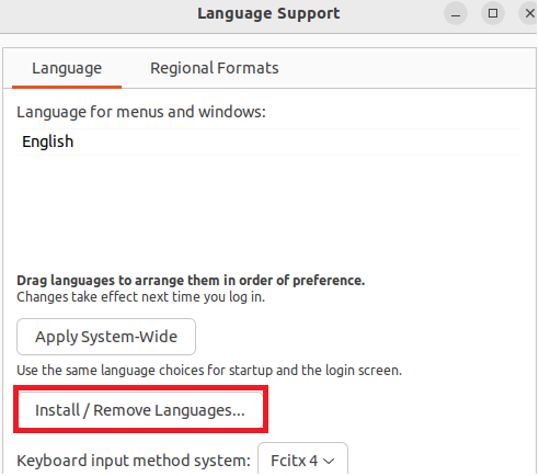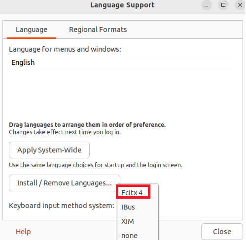Keyboard input method system 부분에서 기본설정이 IBus 되어있는데 이걸 Fcitx 4로 변경합니다.