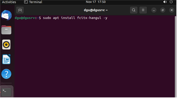 먼저 한국어 입력기 설치를 위해 apt install fcitx-hangul -y를 설치해줍니다.